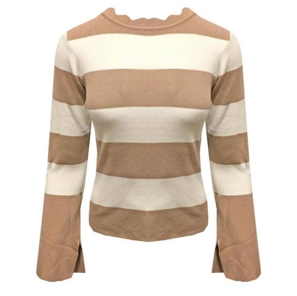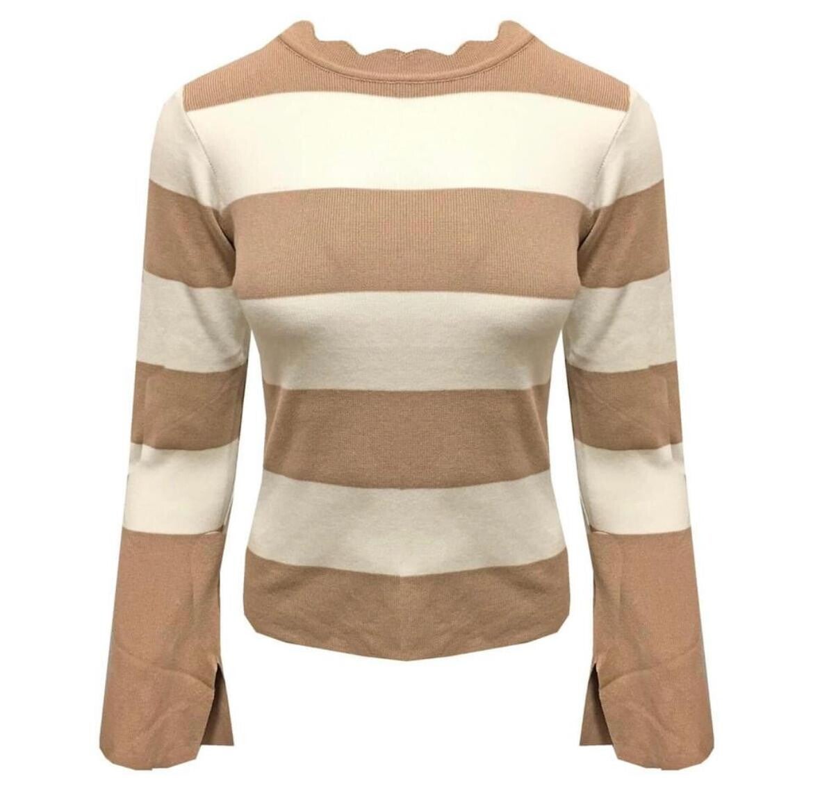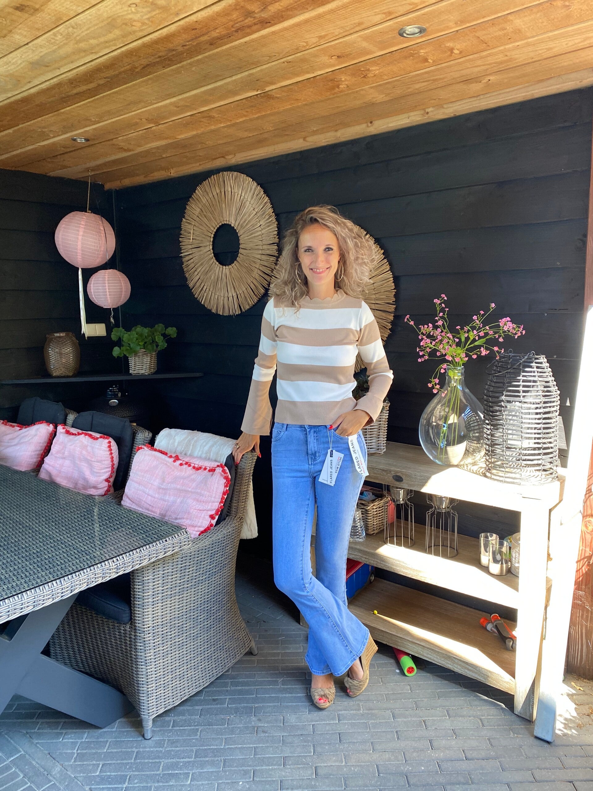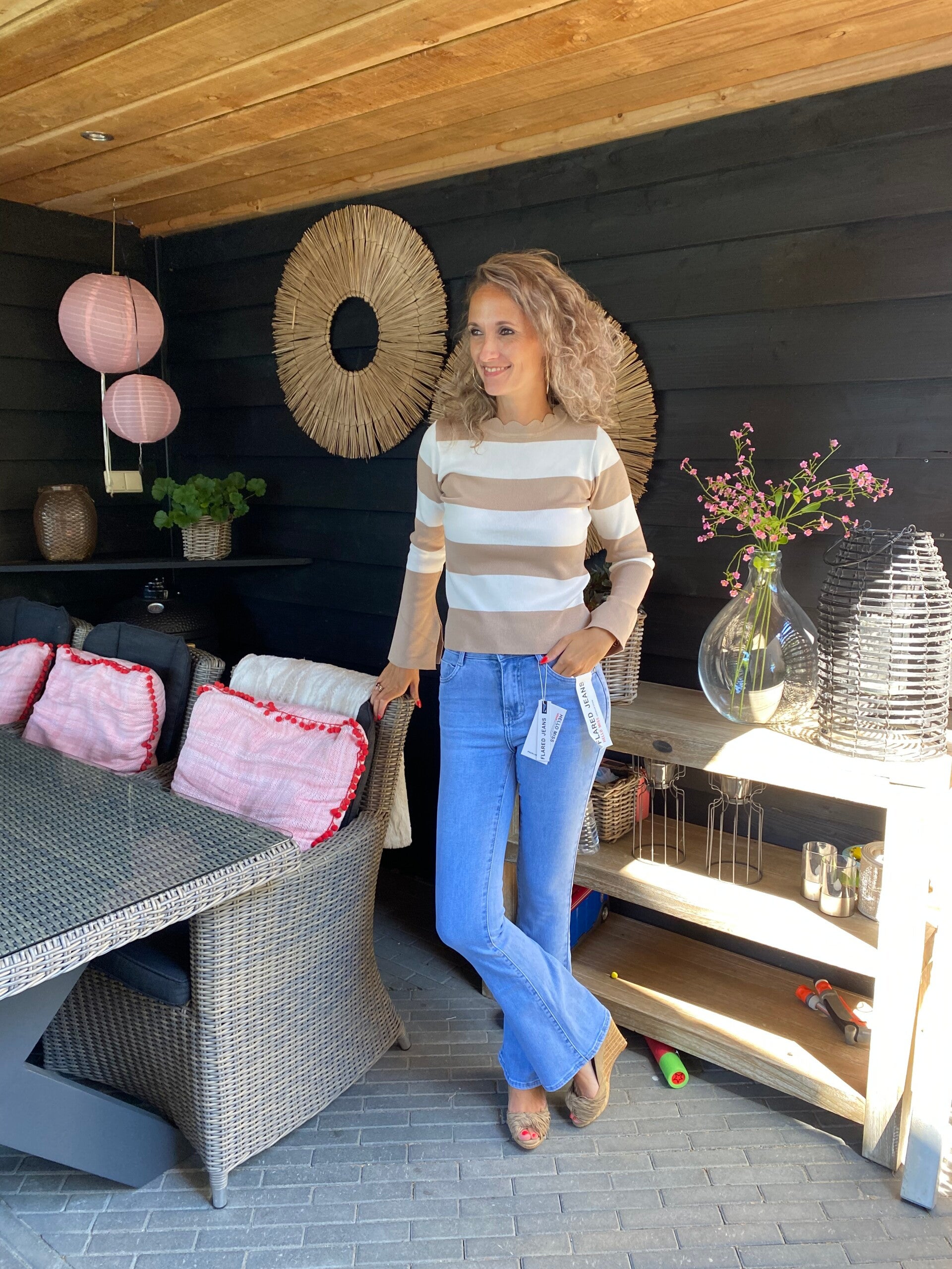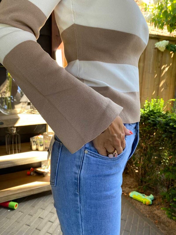 Dit truitje is beige en wit gestreept. Makkelijk te combineren. Aan de hals aparter afgewerkt en de mouw iets wijder aan de onderzijde. Ons model draagt haar eigen maat S/M