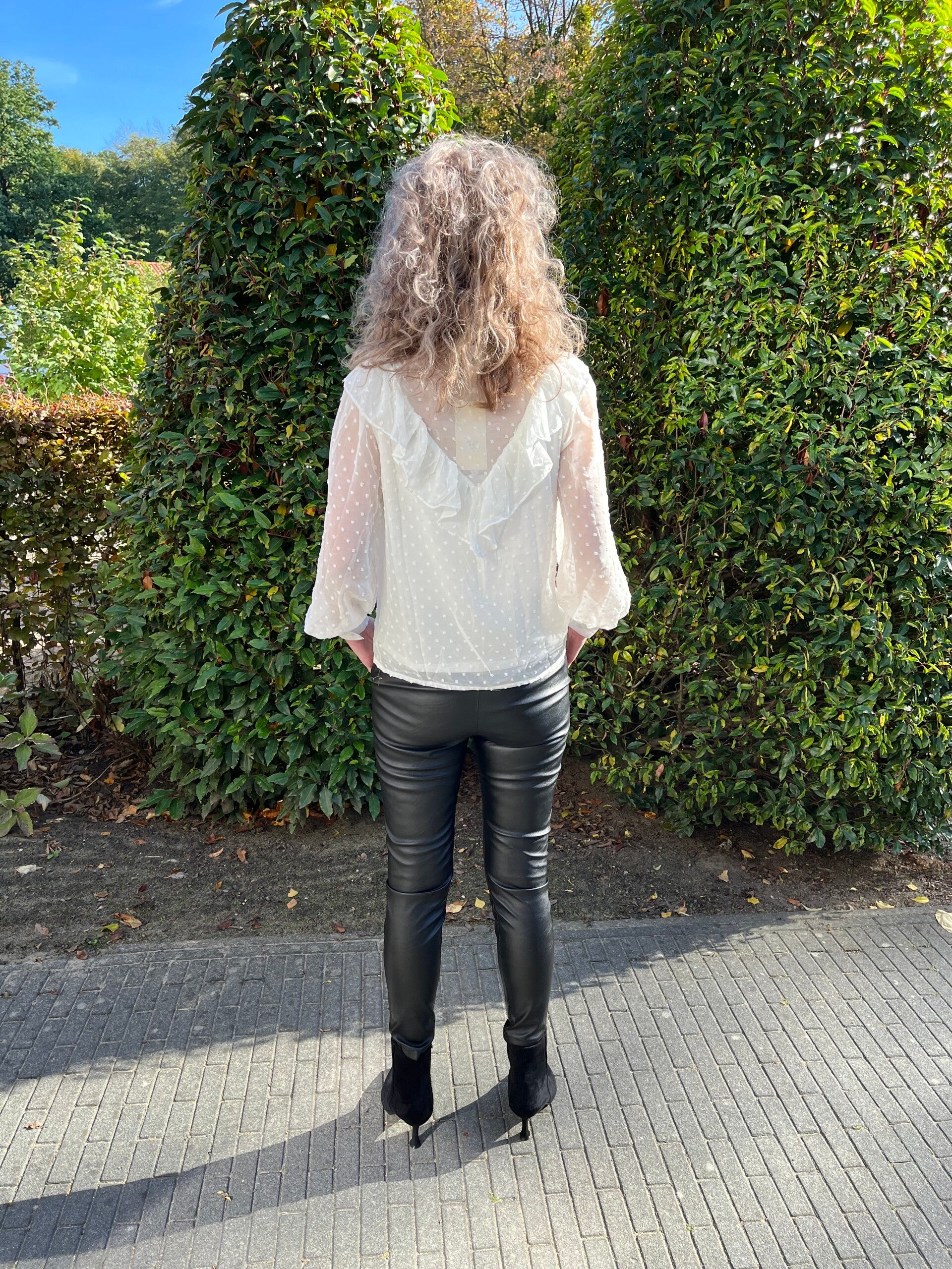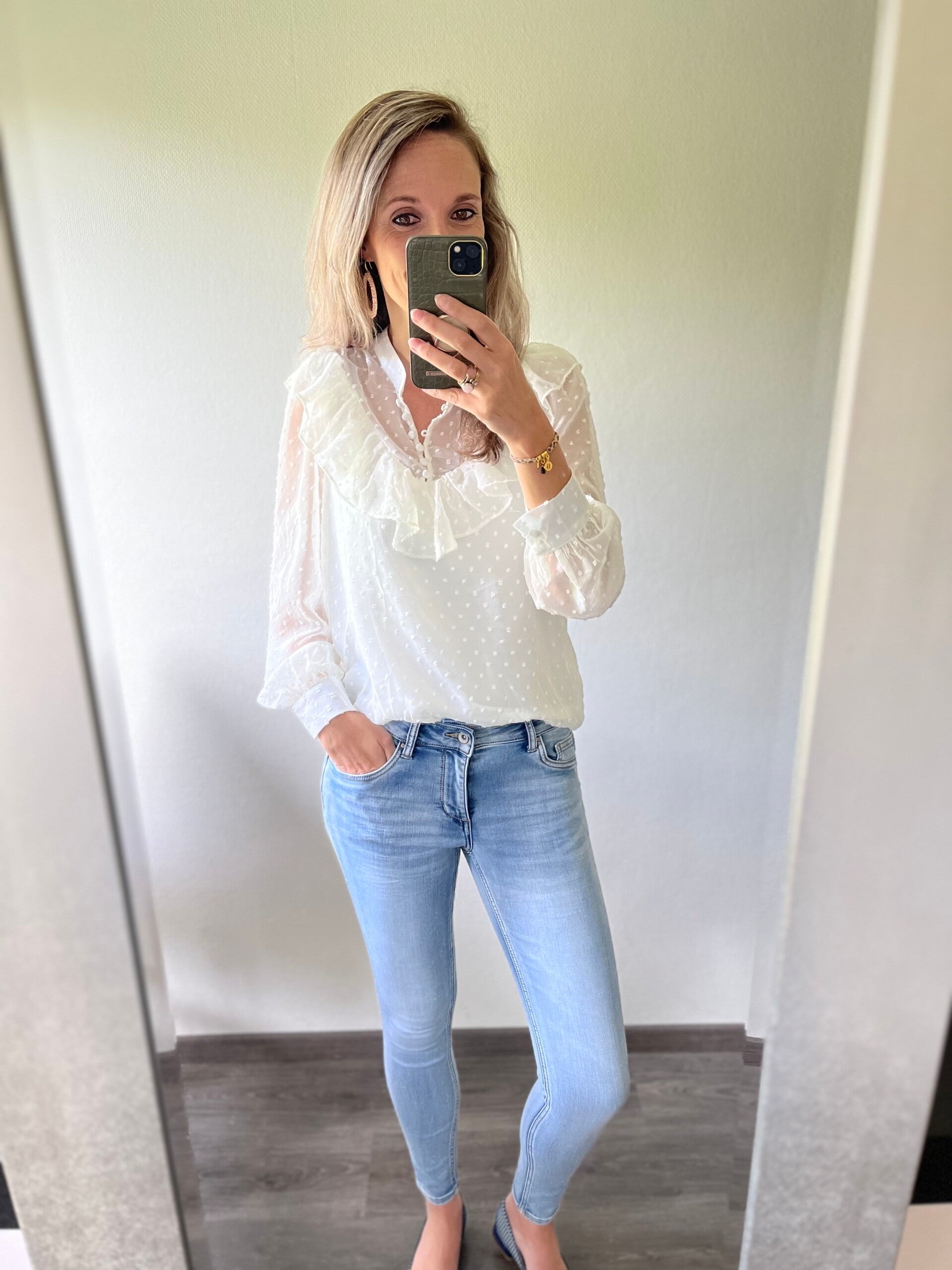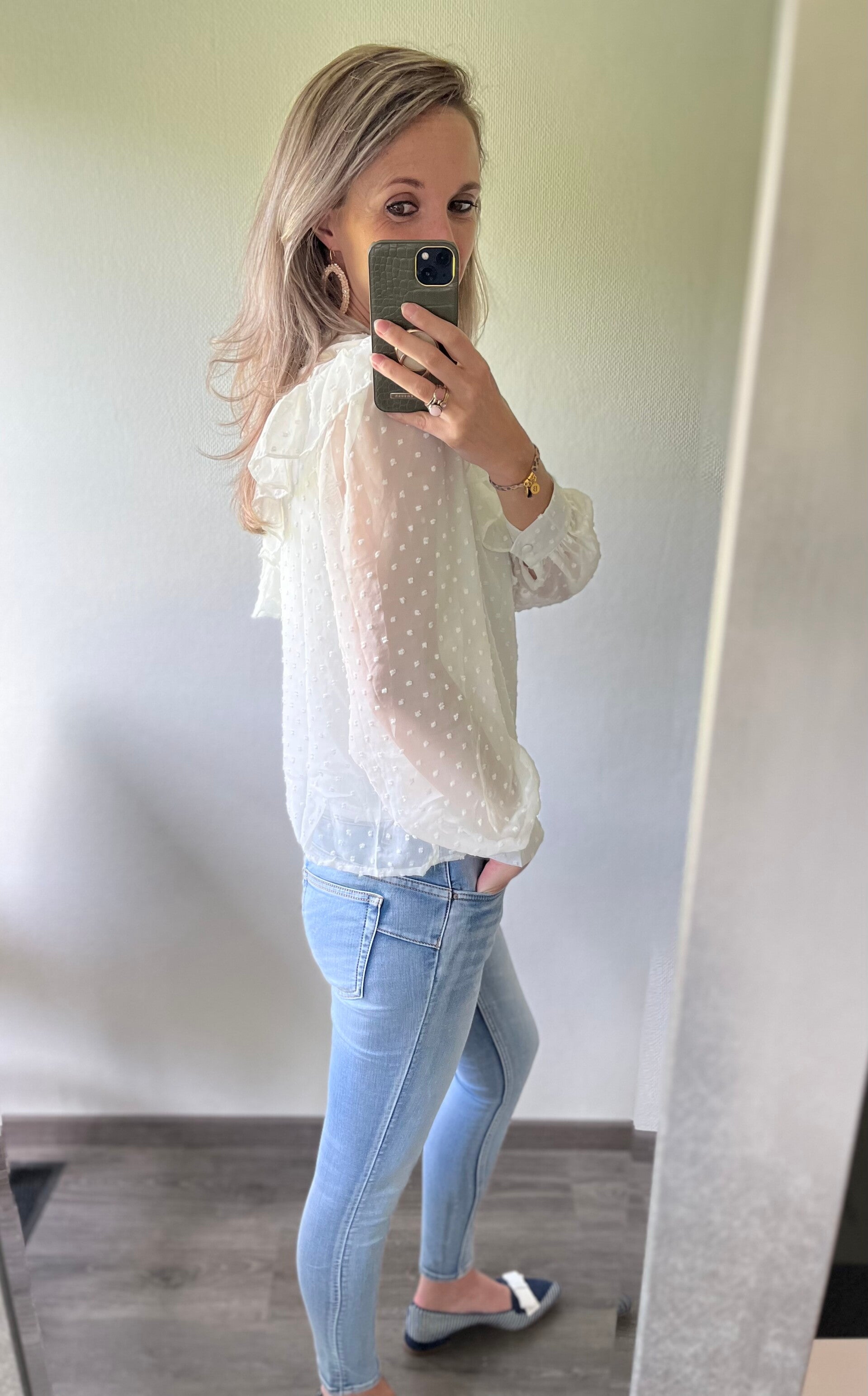 Dit schattige blousje is erg mooi afgewerkt met knopen en een roesel over de borst. Er zit een voering in waardoor je geen hemdje eronder hoeft te dragen. Het blousje valt op maat.