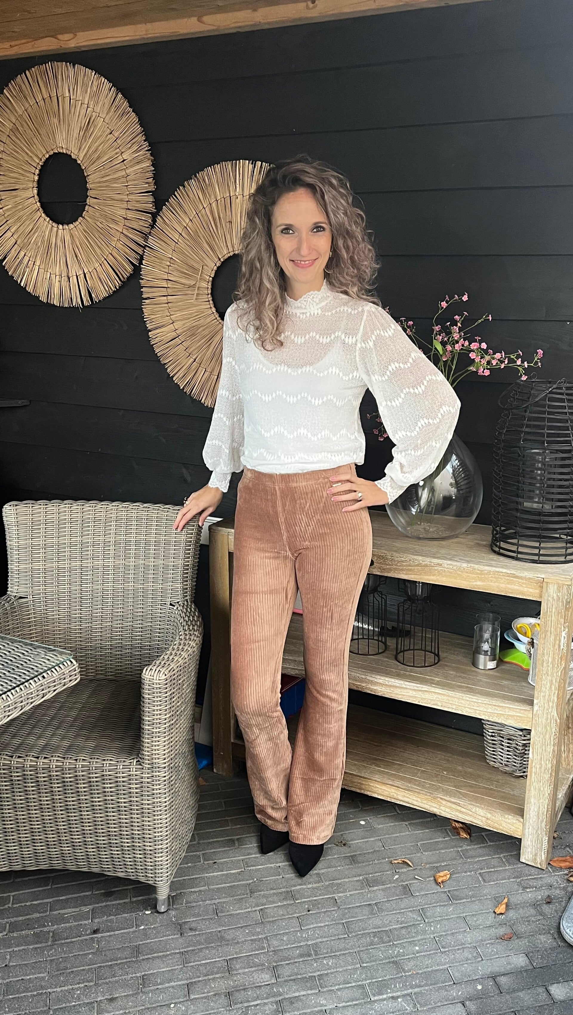 Deze broek heeft een super zachte stof, wijd uitlopende broekspijpen, een elastische tailleband, een fluwelen ribstof.