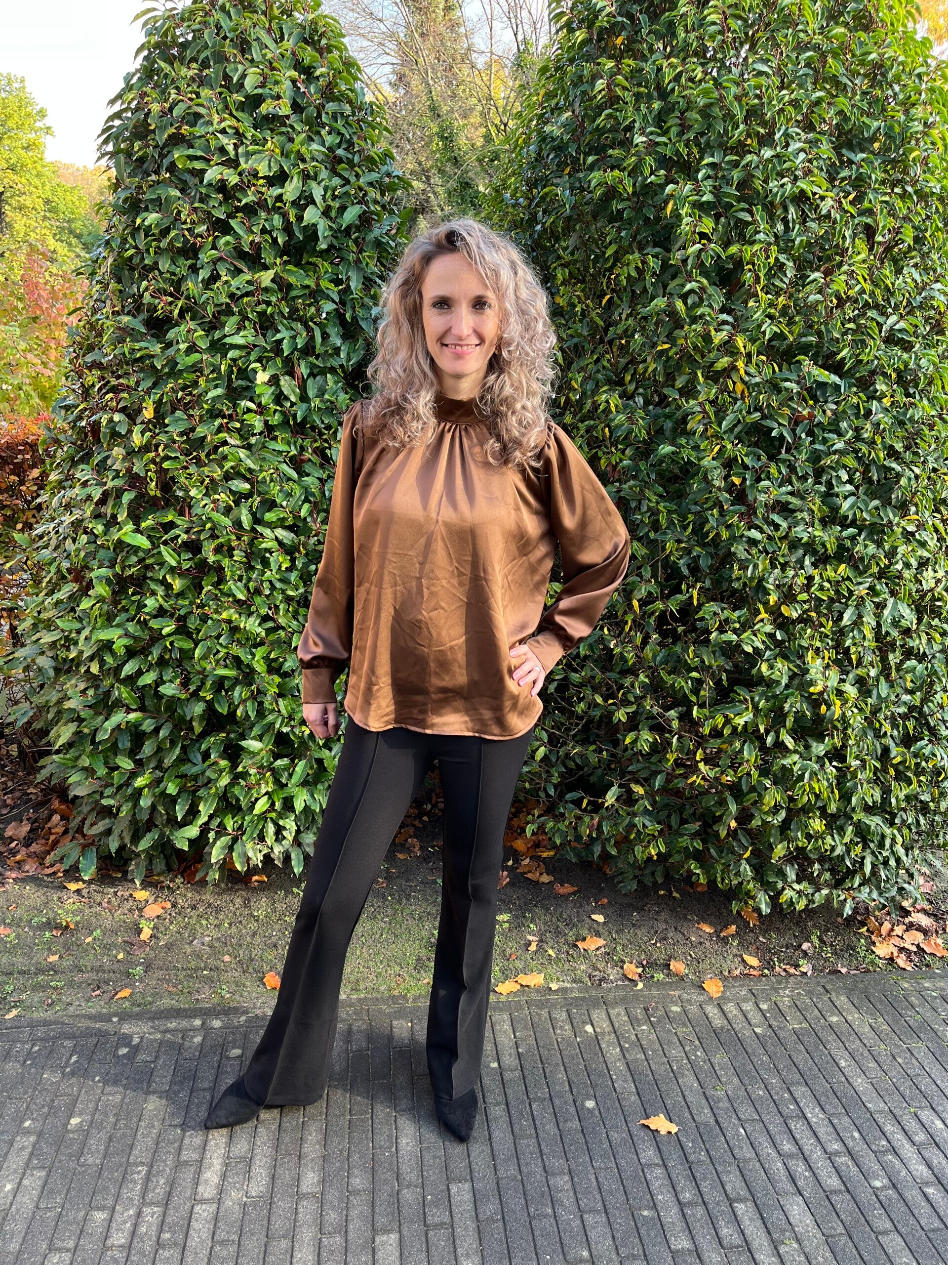 Deze flair broek sluit aan de zijkant met een rits. Er zit goed stretch in de broek en is een hoog model. De broek valt op maat.