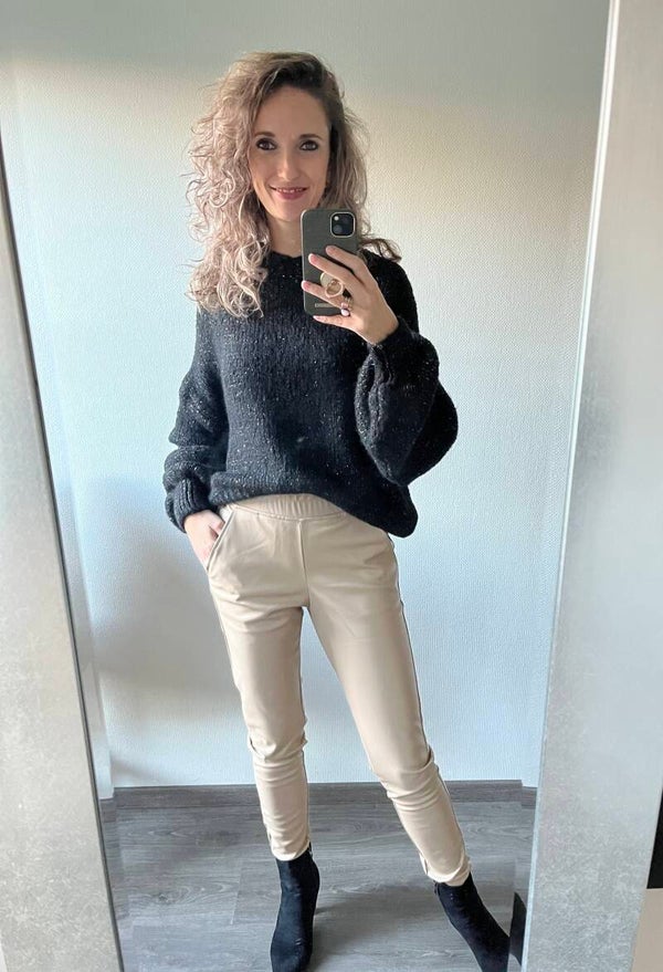 MUSTHAVE! Deze imitatieleren broek mag absoluut niet ontbreken in jouw wardrobe! Het heeft een super zachte stof, is van vegan leer, heeft een hoge taille met elastiek en steekzakken. Onder aan de pijpen heeft de broek een kleine split.