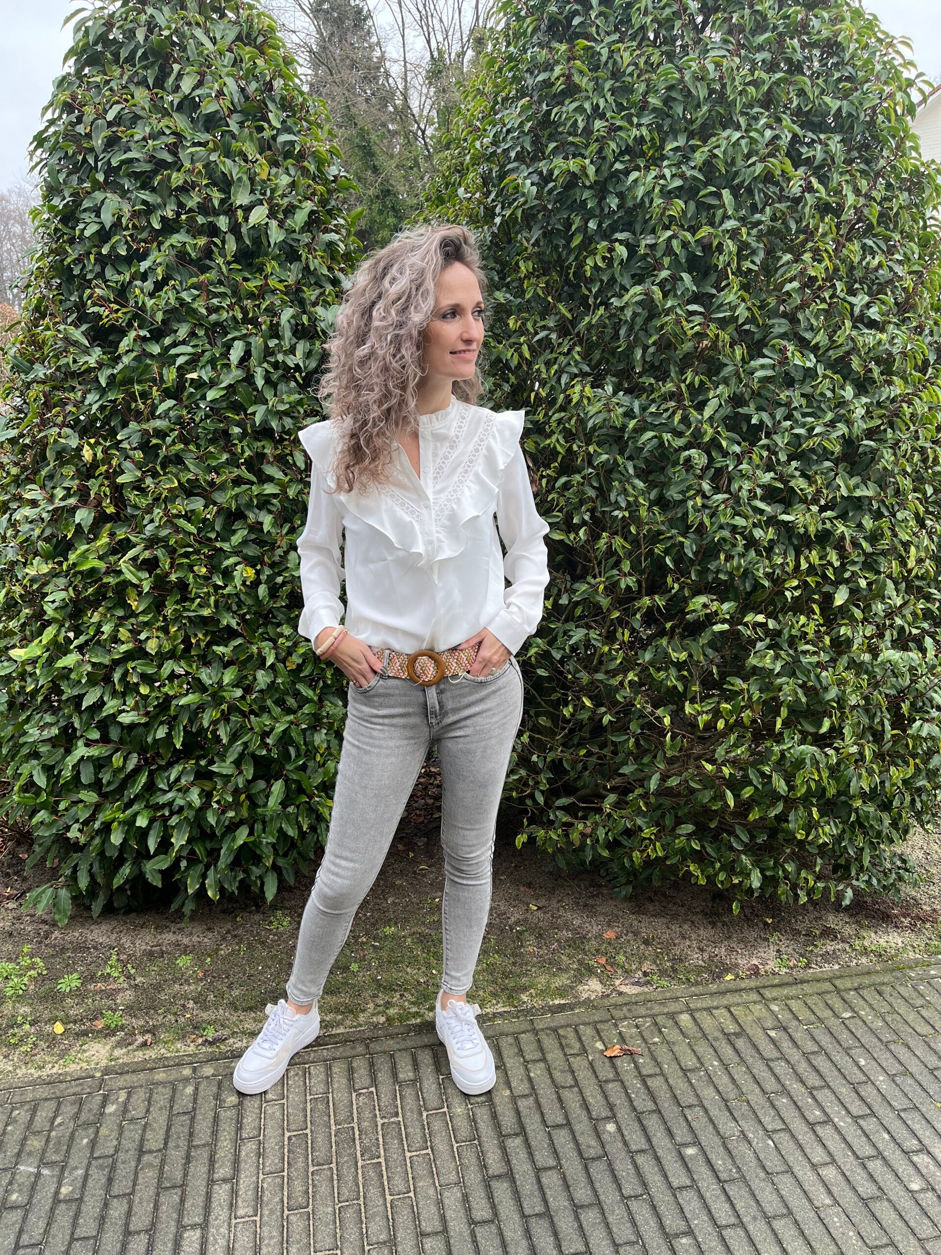 Ons model is 1,74 cm en draagt hier haar eigen maat, maat 36 maar vind deze wel strak zitten.