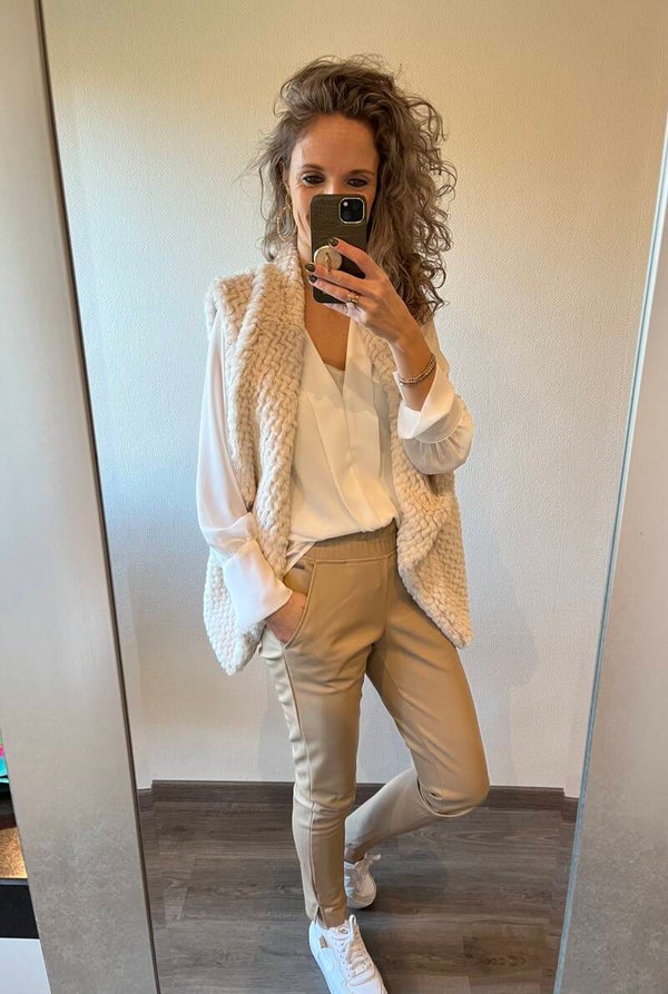 MUSTHAVE! Deze imitatieleren broek mag absoluut niet ontbreken in jouw wardrobe! Het heeft een super zachte stof, is van vegan leer, heeft een hoge taille met elastiek en steekzakken. Onder aan de pijpen heeft de broek een kleine split.