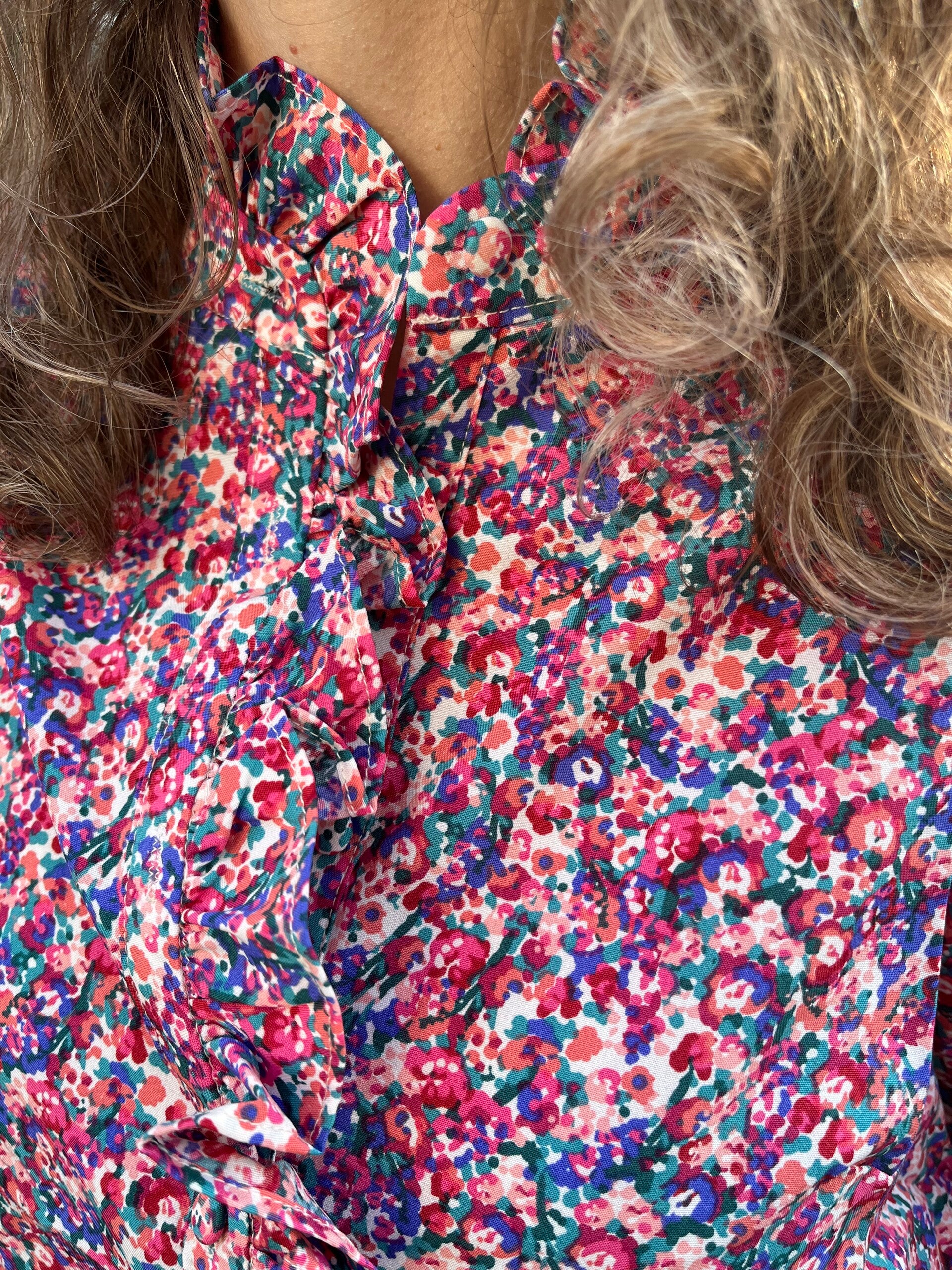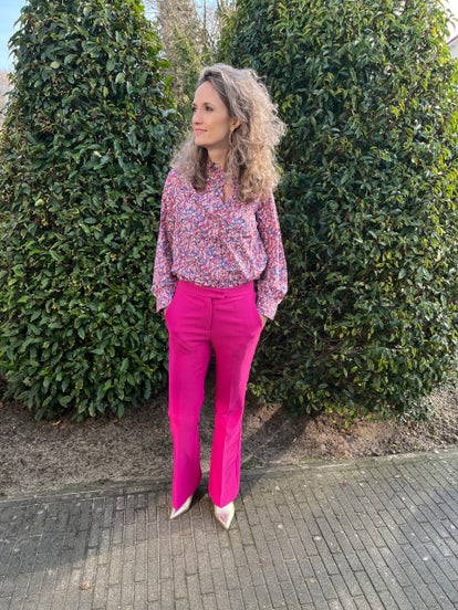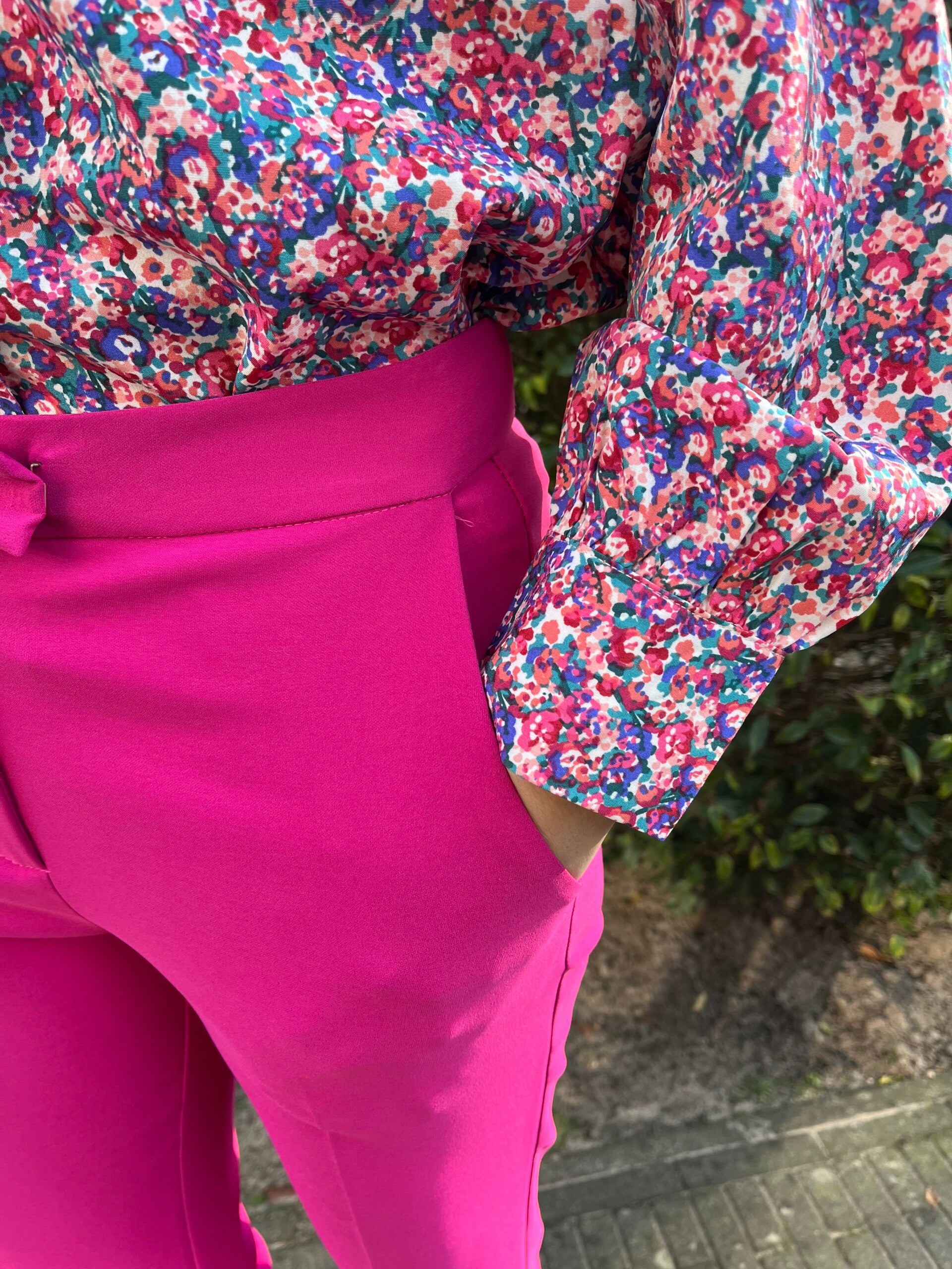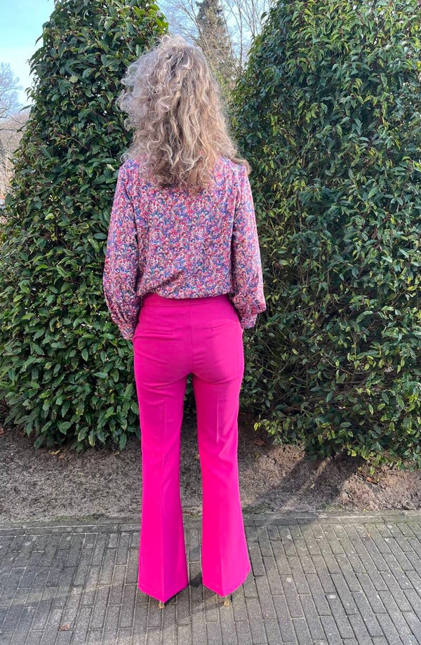 Door de vele kleuren in de blouse kan deze makkelijk gecombineerd worden. Erg leuk aan de voorzijde afgewerkt met iets een roesel. De blouse valt ruimer. We hebben er hier voor gekozen om het te combineren met de mooie fuchsia flair.