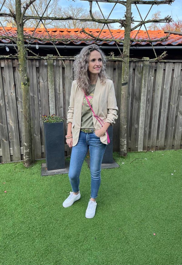 Deze stijlvolle blazer is een echte musthave voor het aankomende seizoen! De mooie beige kleur van de blazer zorgt ervoor dat je keer op keer een statement maakt met dit item. De blazer heeft schoudervulling en twee nep zakjes aan de voorzijde. De mouw is driekwart waardoor dit leuk is naar het voorjaar toe.