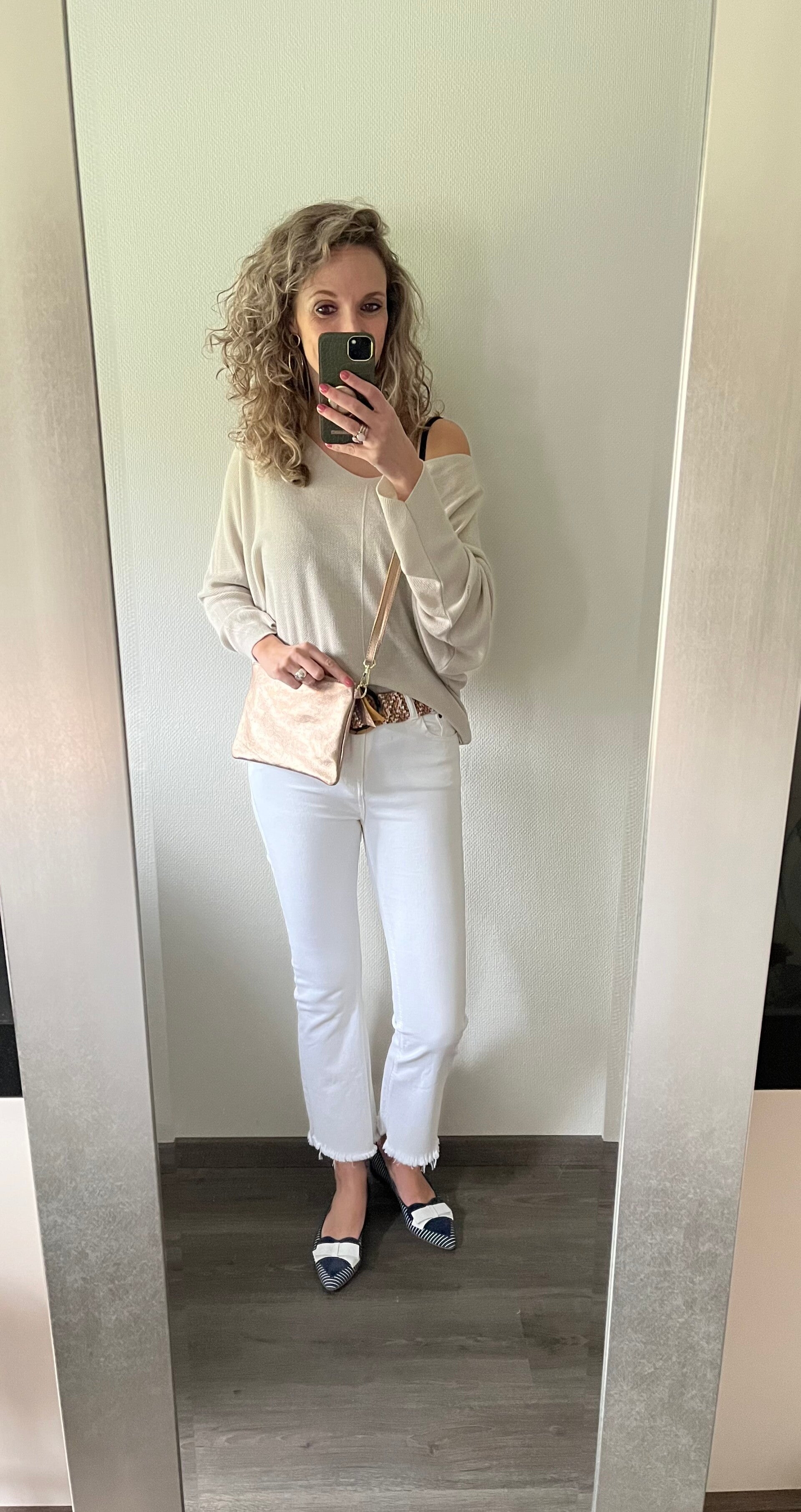 Deze witte broek is een 7/8 model en apart afgewerkt aan de onderkant. De broek bevat veel stretch.